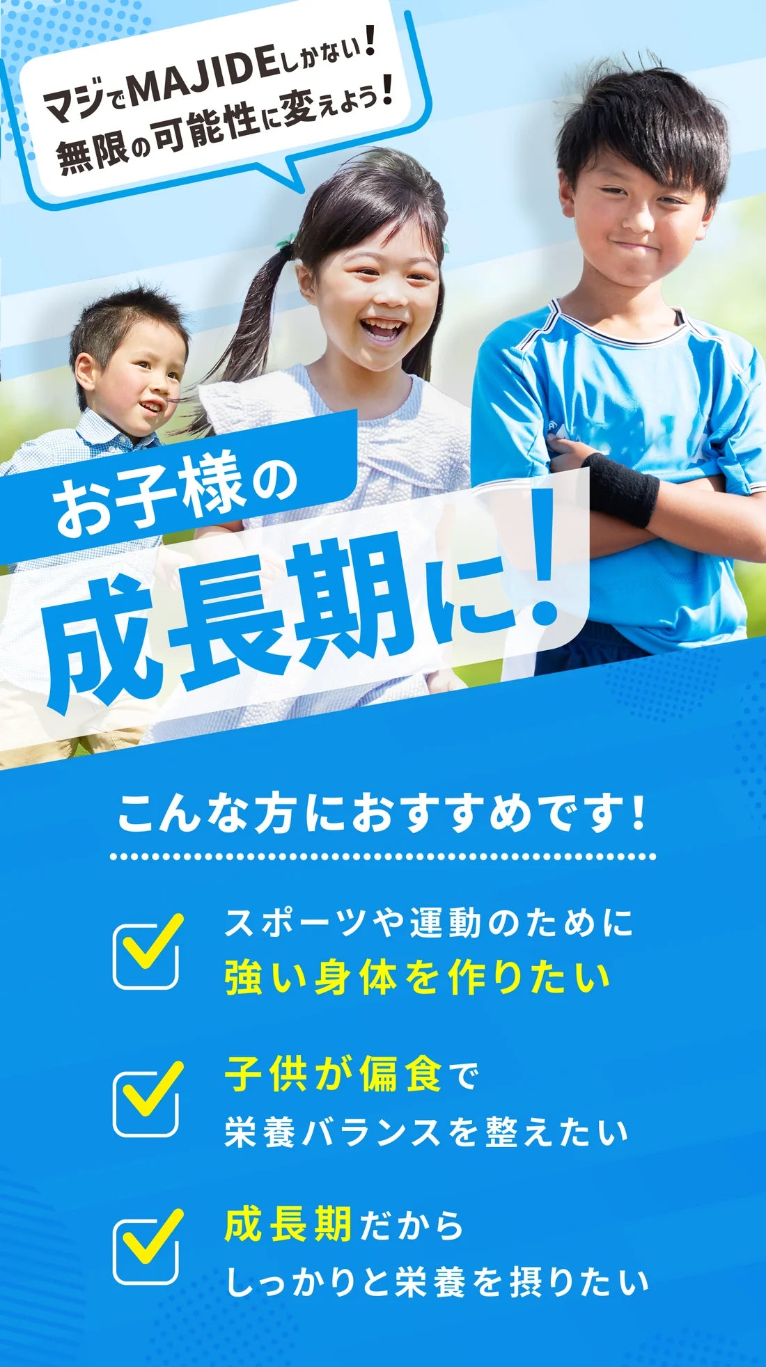 だからこそ、すべての子どもたちが健康課題なく運動や学習に取り組めるように価格にもこだわり、平等に持つ「伸びしろ」を無限大の可能性に変える栄養機能食品を作りました。