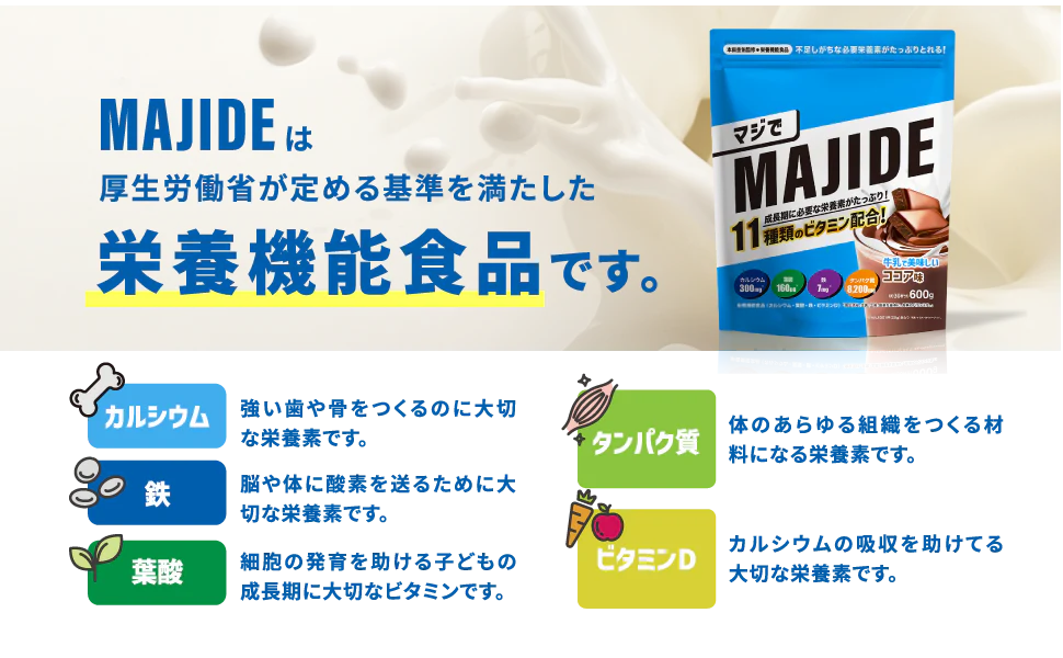 野菜嫌いやお菓子を食べがちな子どもは「ビタミン・ミネラル」が不足しがちです。食事をなかなか食べてくれない子供でも、豊富な栄養素を含むMAJIDEを飲むことによって、栄養素の偏りを補うことができます