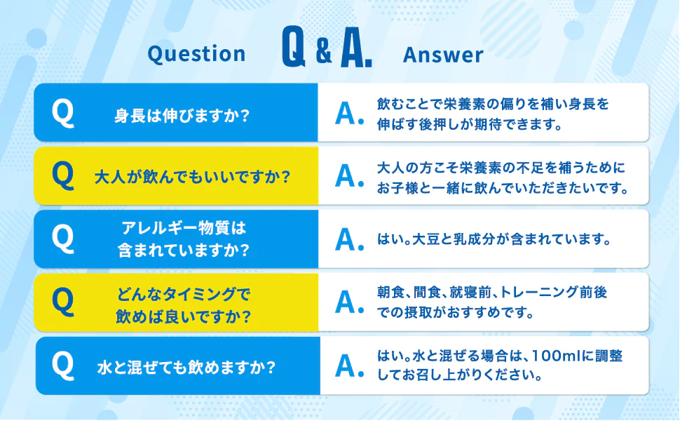 バランスの取れた食事を大前提として、健康な身体作りには「たんぱく質」「カルシウム」「ビタミンD」「ビタミンA」「鉄」が不可欠です。食事で不足しがちな栄養素を補い、子どもの成長をサポートできます