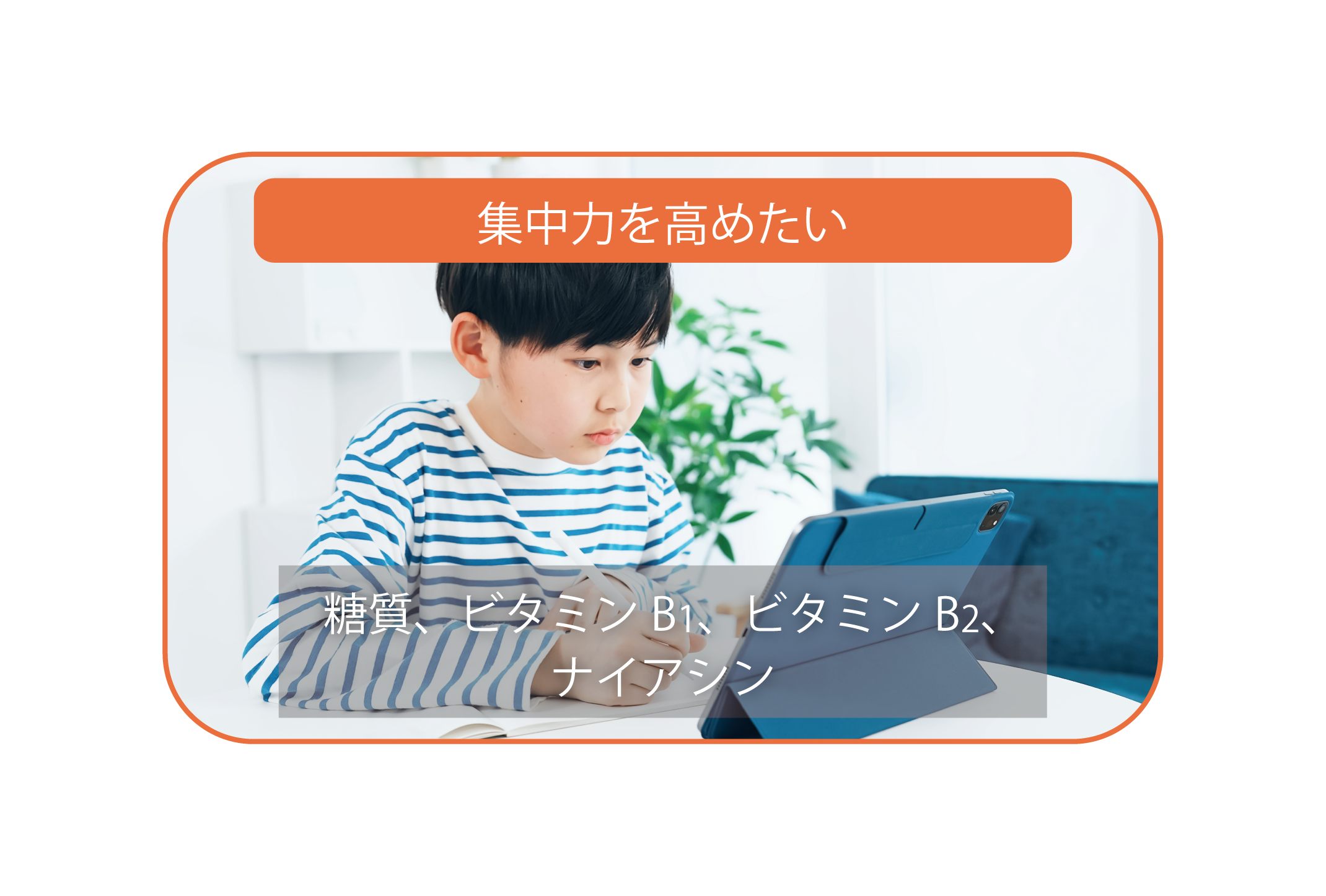 集中力を高めるには「糖質」「ビタミンB1」「ビタミンB2」「ナイアシン」運動や勉強で必要とするエネルギーを補給することで集中力を高める効果を期待できます